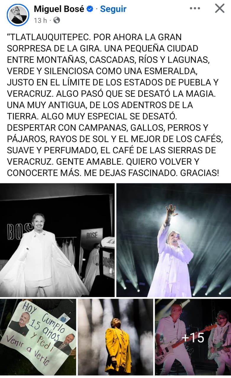 Alberto Rojas, Columna ENFOQUE PRIVADO.- Juan Téllez catapultó al Pueblo Mágico de Tlatlauquitepec con la presentación en su feria de las fiestas patrias del internacional Miguel Bosé, que le dió realce a la feria anual en un evento sin precedentes, ya que el propio artista presumió su visita a esta sierra mágica lo cual destacó en sus redes sociales como la sorpresa de la gira 2025-2026 y sus intensiones de regresar a este bello municipio. De nada sirvieron los ataques contra el Presidente Municipal para opacar la feria la cual fue el ejemplo no solo a nivel regional sino a nivel estado y nacional con esta gran estrella que miles disfrutaron el fin de semana.