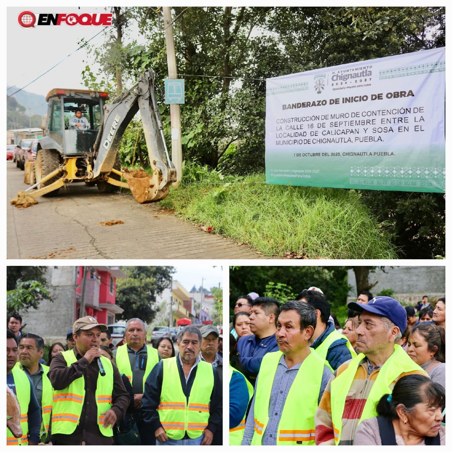 Chignautla, Pue.- La seguridad y la infraestructura urbana reciben un nuevo impulso en Chignautla con el inicio de la construcción de un muro de contención en la calle 16 de Septiembre, vialidad que conecta a las comunidades de Tezotepec y Calicapan. El Presidente Municipal Juan Toral Ramos, informó que esta acción responde a una necesidad urgente derivada del deterioro y las fracturas del pavimento, que representaban un riesgo constante para automovilistas, peatones y transportistas que a diario utilizan esta importante vía de comunicación.
