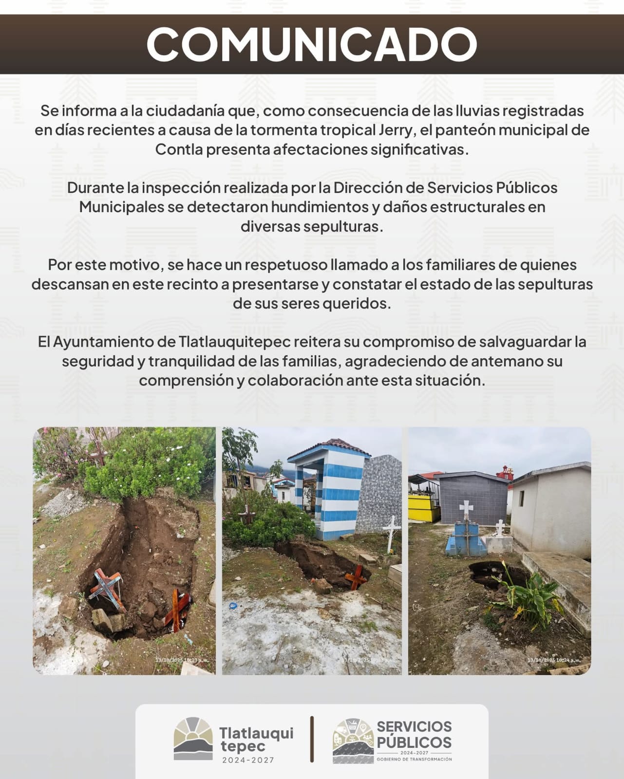 Ante ello, el ayuntamiento de Tlatlauquitepec hizo un llamado a las y los familiares de las personas que descansan en el panteón de Contla para que acudan a verificar el estado de las sepulturas para que cada familia pueda constatar las condiciones en las que se encuentran los espacios y, en caso de daños, coordinar las acciones necesarias junto con el personal municipal.