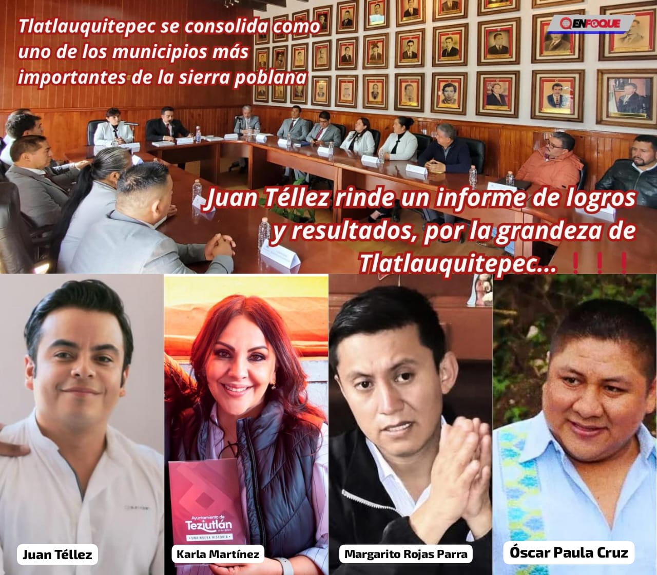 En un año Juan Manuel Téllez Salazar ha hecho un gran equipo con sus regidores, funcionarios, colaboradores y qué decir del gran respaldo que representa su esposa María José Camacho León como presidenta del DIF que ha dado muestras de verdadero compromiso y ambos han logrado tener un contacto directo con la población en todos sus ámbitos sociales, productivos, económicos, profesionales no solo de la cabecera municipal sino de las comunidades y Juntas Auxiliares. En un año Tlatlauquitepec ha avanzado lo que no hizo en doce años en que un personaje ostentó el poder y que lo único que hizo fue llevar al municipio al retroceso, ya que mantuvo a la cabecera municipal olvidada mientras a las comunidades las sumía en la miseria al promover el alcoholismo, ya que para mantenerlos contentos les pagaba cuánta fiesta se le ponía enfrente, bailes y rodeos, es decir pan y circo mientras él y su familia se enriquecieron a manos llenas y no conformes con eso despojaron al pueblo de un inmueble que cedió a su hija que es "Casa Olvera" y que por fortuna ya se recuperó y ya está de nueva cuenta al servicio de los tlatlauquenses, además del saqueo a las arcas municipales, obras inconclusas como la del reclusorio o que tal las obras fantasmas que cobraron y que nunca se ejecutaron.
