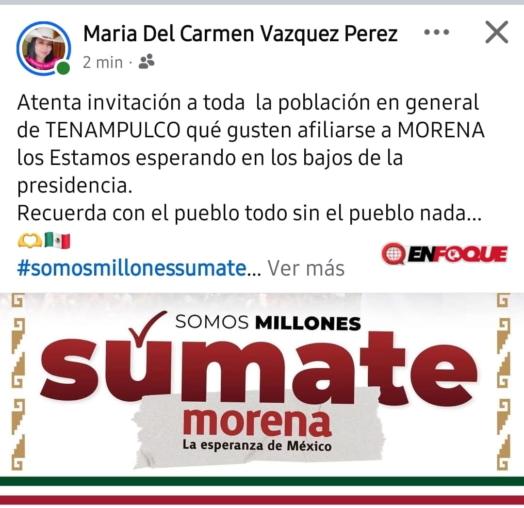 Alberto Rojas, Columna ENFOQUE PRIVADO.- Sin pudor alguno, servidores públicos del gobierno estatal y municipal de distintos puntos de la entidad han sido vistos participando en tareas partidistas a favor de Morena, utilizando espacios oficiales para promover la afiliación al partido del nefasto y corrupto Andrés Manuel López Obrador; uno de estos casos se vive en Tenampulco donde la titular de la Coordinación de Desarrollo Educativo (Corde) de Teziutlán, María del Carmen Vázquez Pérez, fue sorprendida esta mañana instalando un módulo de afiliación en los bajos del Palacio Municipal. Lo más grave es que la propia funcionaria difundió la convocatoria desde sus redes sociales, evidenciando que este tipo de acciones se realizan abiertamente, sin temor a sanción alguna ya que es un clara delito.