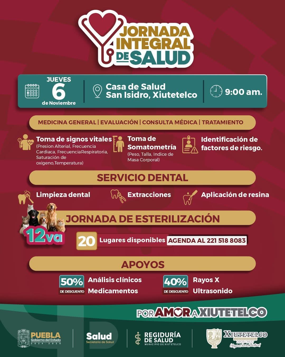Xiutetelco, Pue.- El acceso a la salud de fortalecerá en Xiutetelco con la Jornada Integral de Salud dirigida a todas las familias de San Isidro y comunidades cercanas, la iniciativa busca acercar servicios médicos esenciales y acciones preventivas directamente a la población, sin necesidad de traslados y con personal capacitado para la atención inmediata.
