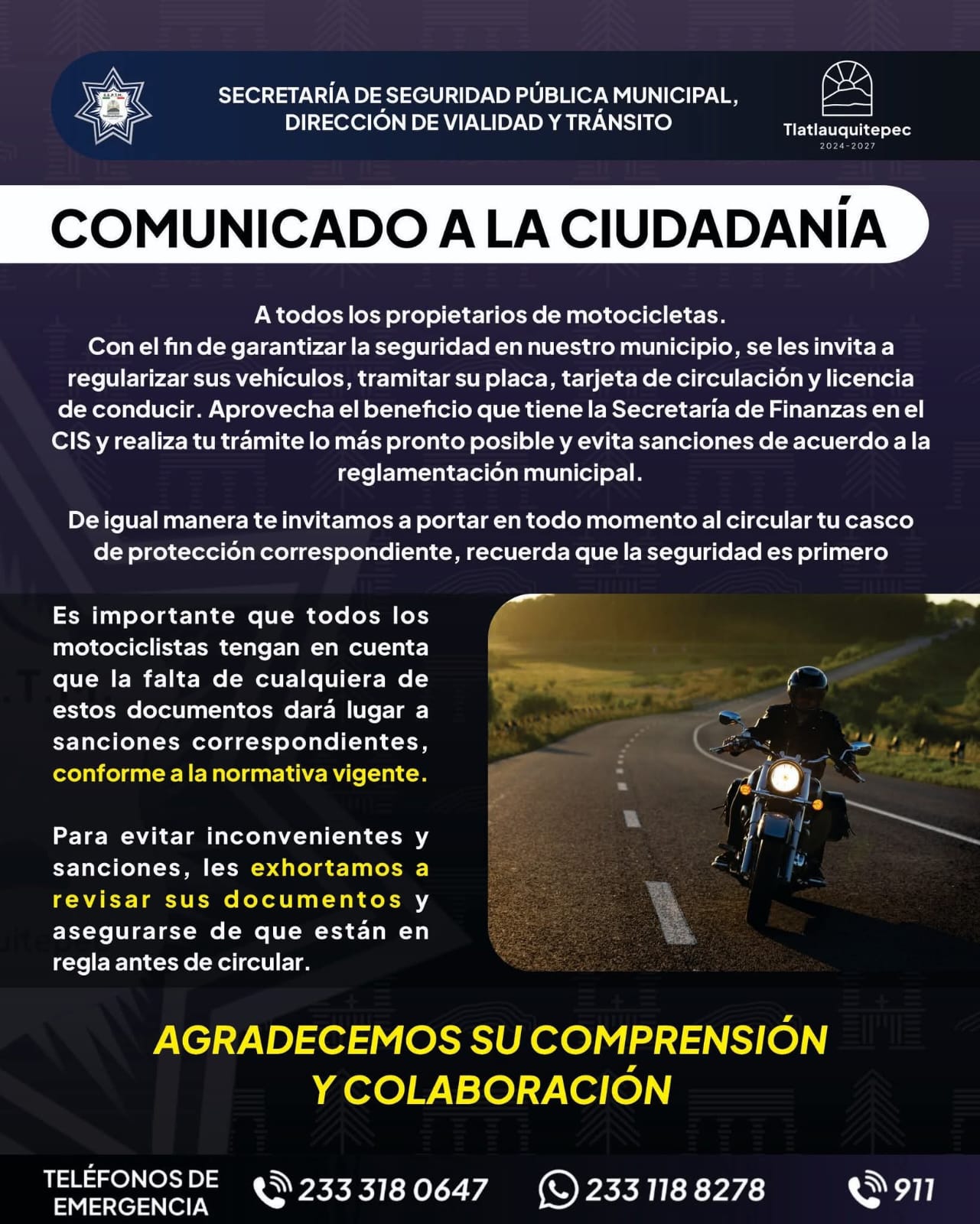 A través de un comunicado de la Secretaría de Seguridad Pública Municipal y la Dirección de Vialidad y Tránsito se informó que los motociclistas deben tramitar su placa, tarjeta de circulación y licencia de conducir, así como mantener sus vehículos en regla, para facilitar este proceso, se invitó a aprovechar el apoyo que ofrece la Secretaría de Finanzas en el CIS, con el fin de realizar estos trámites lo más pronto posible.