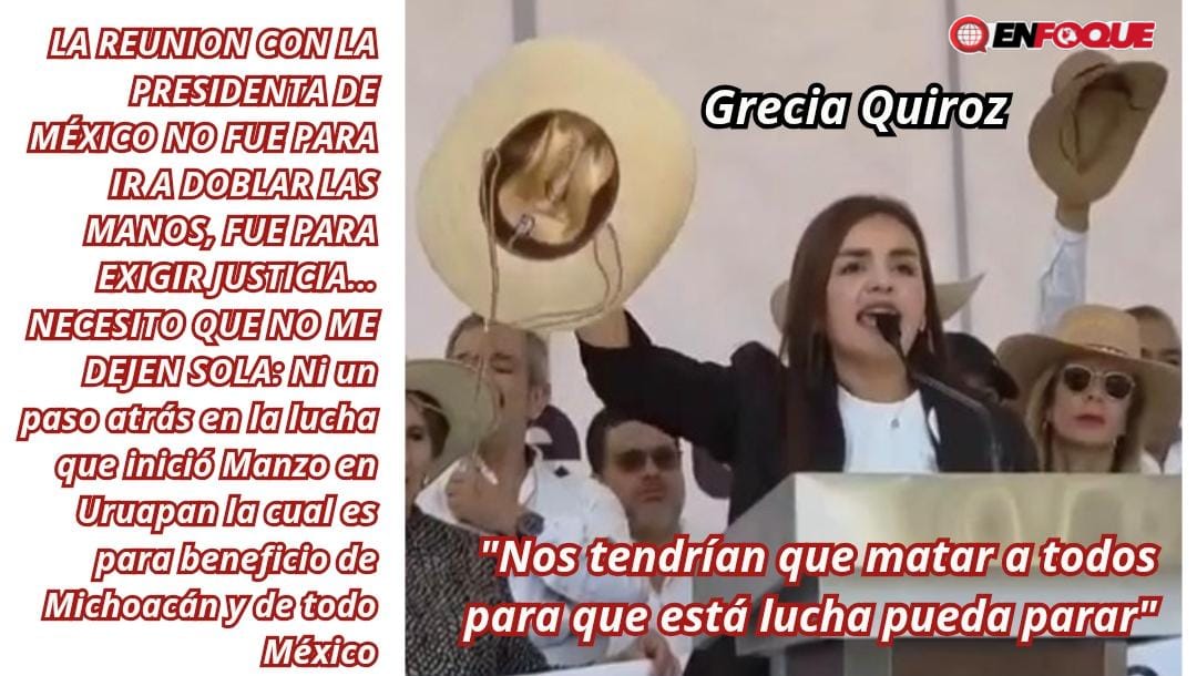 Grecia Quiroz habló con firmeza al recordar que la lucha por la justicia no se detendrá, aun con las amenazas o los riesgos que eso implique, "Nos tendrían que matar a todos para que esta lucha pueda parar”, sentenció frente a la multitud y reiteró que seguirá pidiendo la intervención de las autoridades para que se capture a los responsables y se garantice la seguridad de los ciudadanos.