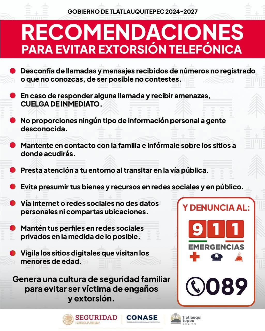El a través de un comunicado el ayuntamiento informó que, ante cualquier llamada de un número desconocido, lo más recomendable es no contestar, en caso de hacerlo y recibir amenazas, la acción inmediata debe ser colgar y evitar continuar con la conversación recordando a los ciudadanos que ninguna autoridad ni institución legítima solicita información personal por teléfono, por lo que compartir datos personales, ubicaciones o información familiar puede poner en riesgo la integridad de las personas.