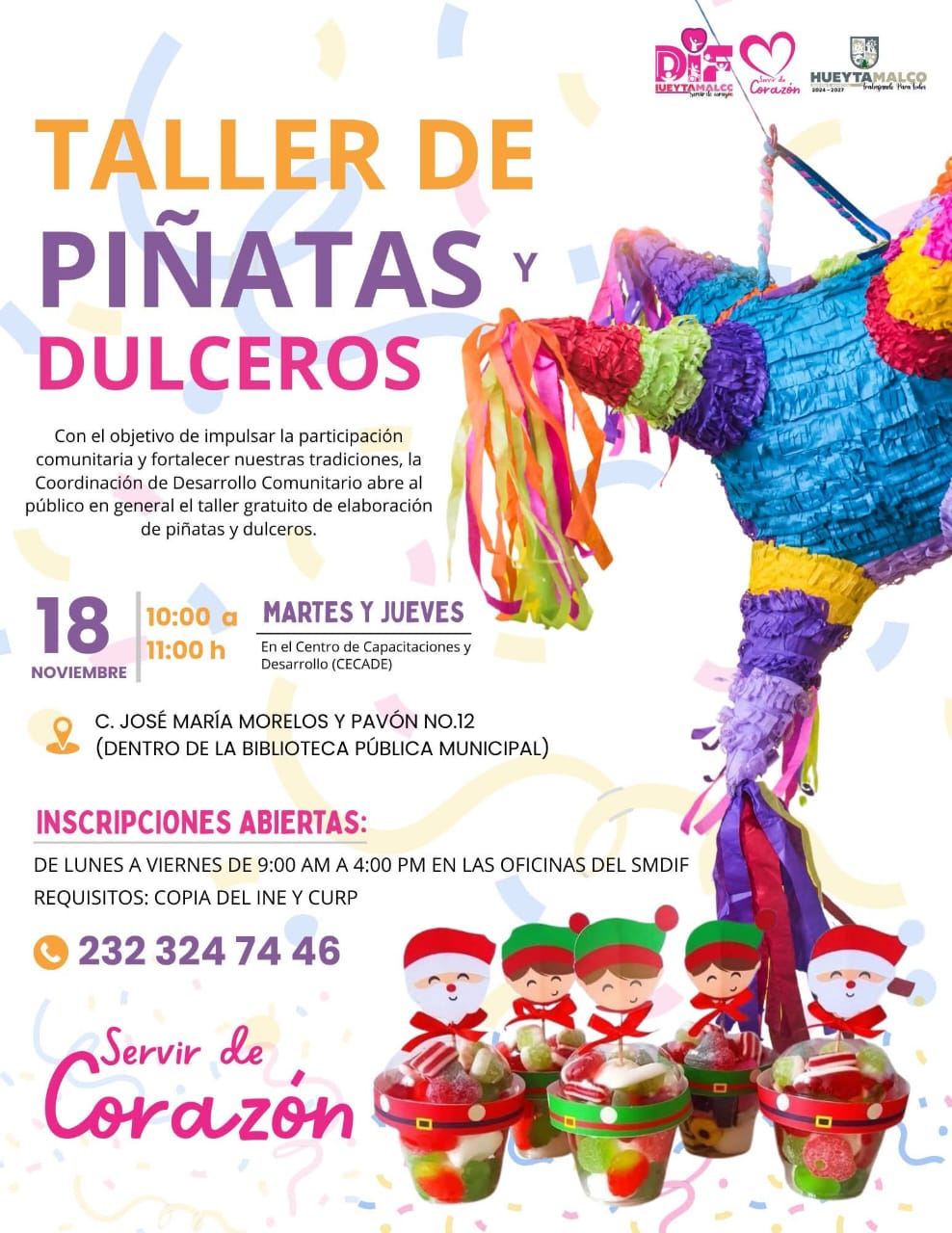 Hueytamalco, Pue.- Con la finalidad de mantener vivas las tradiciones que dan identidad a las celebraciones decembrinas, el Ayuntamiento de Hueytamalco a cargo de Iván Luna Rivera en coordinación con el DIF encabezado por Lisset Báez, anunció el Taller gratuito de elaboración de piñatas y dulceros, una actividad dirigida a personas de todas las edades interesadas en aprender y compartir técnicas artesanales típicas de la temporada.