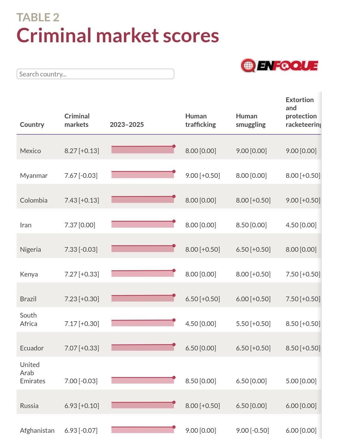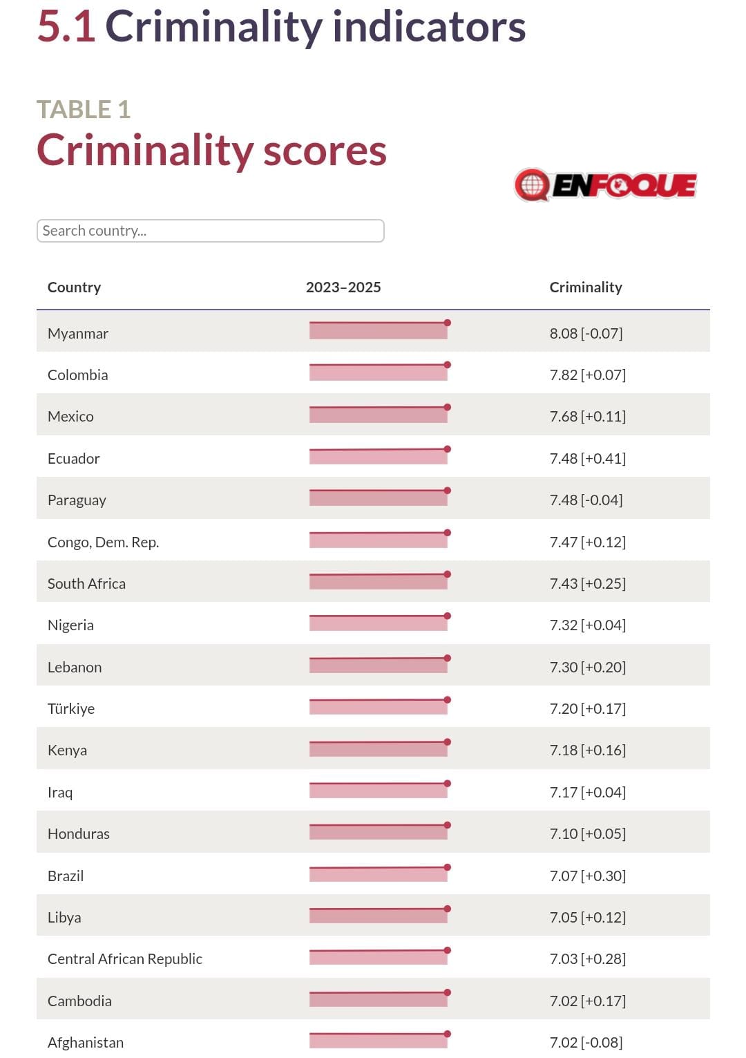 El Índice Global 2025 lo coloca en los niveles más altos de criminalidad y mercados ilícitos, con baja resiliencia institucional
