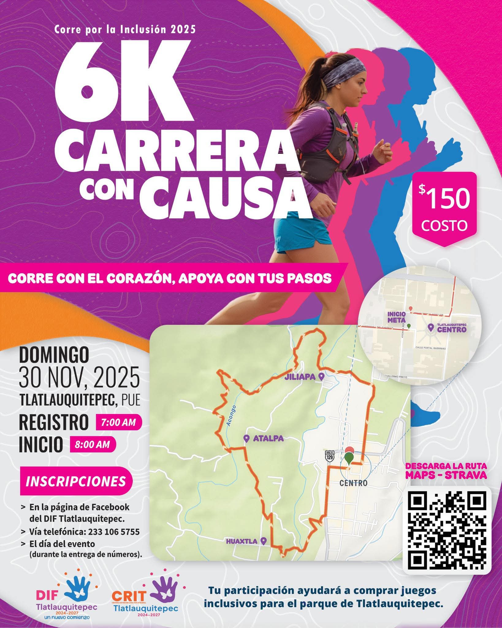 La cita es el domingo 30 de Noviembre, la carrera iniciará en el centro de Tlatlauquitepec; participa con el corazón porque cada uno de tus pasos es para brindarle mayores oportunidades de crecimiento, desarrollo e inclusión de los niños de este municipio. "Tu participación ayudará a adquirir juegos inclusivos para el parque de Tlatlauquitepec, promoviendo espacios donde todas las niñas y niños puedan disfrutar y convivir.