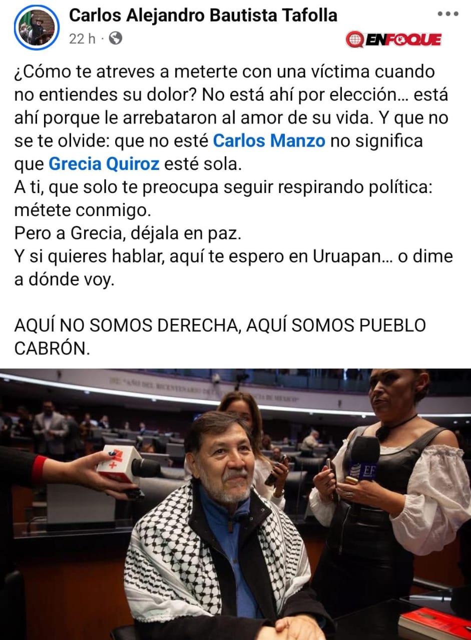 México, CDMX.- Cuando se supone que el debate público debería enfocarse en la violencia contra las mujeres, ya que ayer fue 25 de Noviembre Día Internacional de la Eliminación de la Violencia Contra las Mujeres, estalló otra polémica del senador de la 4T Gerardo Fernández Noroña, quien arremetió contra la alcaldesa de Uruapan, Michoacán Grecia Quiroz, llamándola “ambiciosa” y diciendo que había tomado una “línea fascista”. Sus palabras no pasaron desapercibidas y de inmediato distintas personalidades reaccionaron, entre ellos el diputado Carlos Bautista, del Movimiento del Sombrero, lo retó en redes sociales y expresó “métete conmigo, pero a Grecia déjala en paz”.