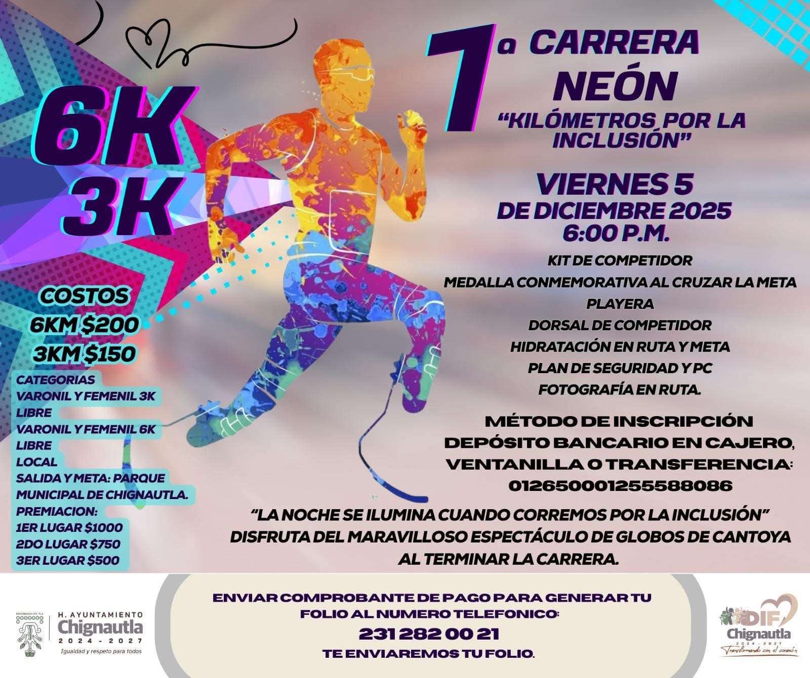 Se realizará el viernes 5 de Diciembre a las seis de la tarde, con dos rutas disponibles que son 6 kilómetros y 3 kilómetros, cuyos costos de inscripción serán de 200 y 150 pesos, las categorías contemplan ramas varonil y femenil. La salida y meta estarán ubicadas en el Parque Municipal de Chignautla, donde las y los participantes podrán disfrutar de una experiencia deportiva acompañada de ambiente neón y actividades especiales.