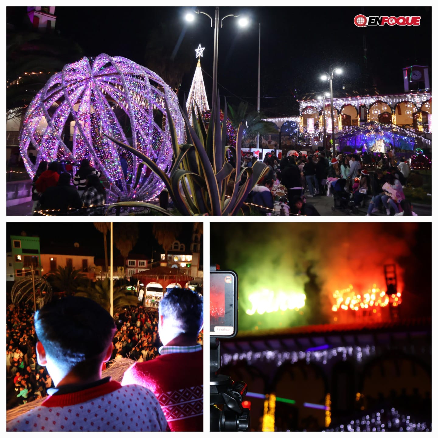 El espectáculo que acompañó la ceremonia incluyó luces, efectos láser, nieve artificial y un show de pirotecnia que iluminó el cielo nocturno, generando una atmósfera llena de emoción para niñas, niños, jóvenes y adultos; estos elementos se sumaron al momento simbólico del encendido, que fue recibido con aplausos y entusiasmo por los asistentes.
