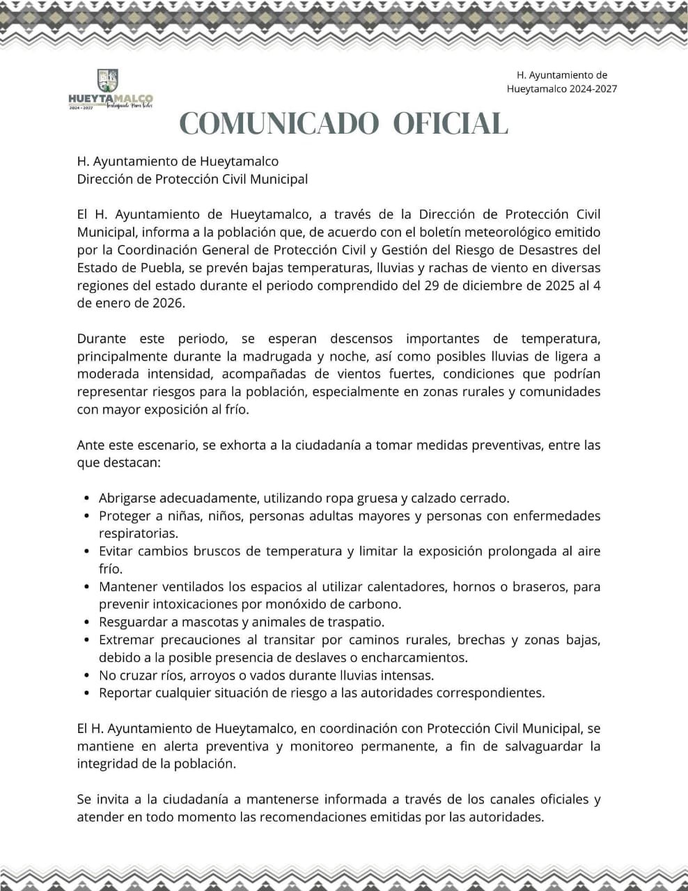 Ante este panorama, el gobierno de Hueytamalco, activó acciones preventivas a través de la Dirección de Protección Civil Municipal, con el objetivo de reducir riesgos y salvaguardar la integridad de la población destacando que entre las principales medidas se encuentra el monitoreo permanente de las condiciones climáticas, la emisión de recomendaciones oficiales y el llamado constante a la ciudadanía para adoptar prácticas de autocuidado frente a las bajas temperaturas.