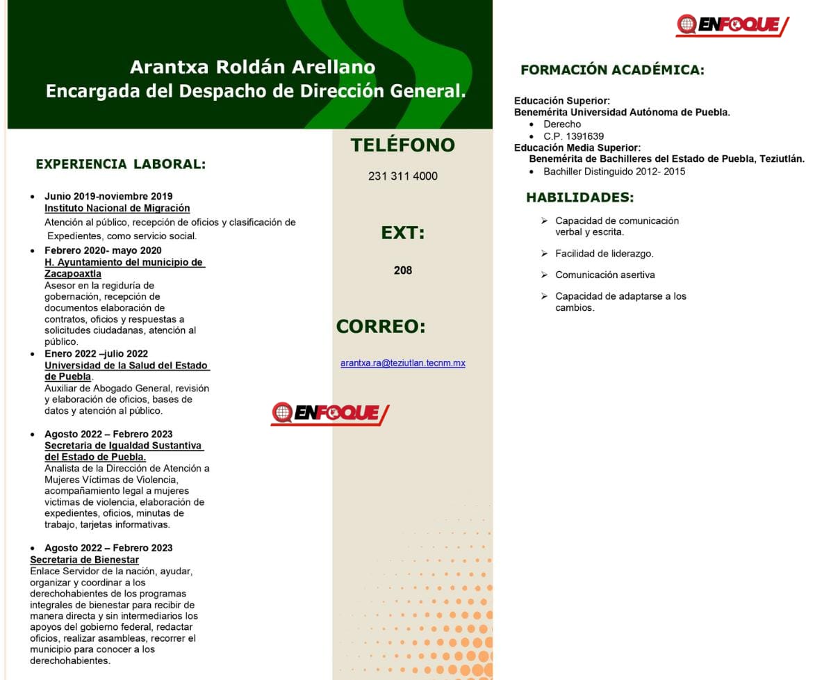El currículum oficial de Arantxa Roldán Arellano detalla que su trayectoria inicia en 2019 con un periodo de servicio social en el Instituto Nacional de Migración (INM), donde realizó labores de atención al público, recepción de oficios y clasificación de expedientes, posteriormente, en 2020, aparece un cargo como asesora en la regiduría de Gobernación del Ayuntamiento de Zacapoaxtla, con funciones administrativas como elaboración de oficios, contratos y atención ciudadana y en 2022 y 2023, su experiencia se concentra en dependencias estatales, como la Universidad de la Salud del Estado de Puebla, la Secretaría de Igualdad Sustantiva y la Secretaría de Bienestar, siempre en puestos de análisis, enlace o apoyo jurídico-administrativo, sin que se registre experiencia en dirección institucional, planeación académica, gestión educativa o toma de decisiones universitarias de alto nivel y destacando que no se contempla su periodo como delegada regional de la Secretaría de Deporte y Juventud del estado.