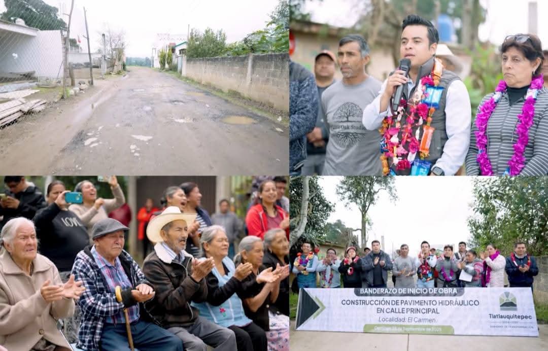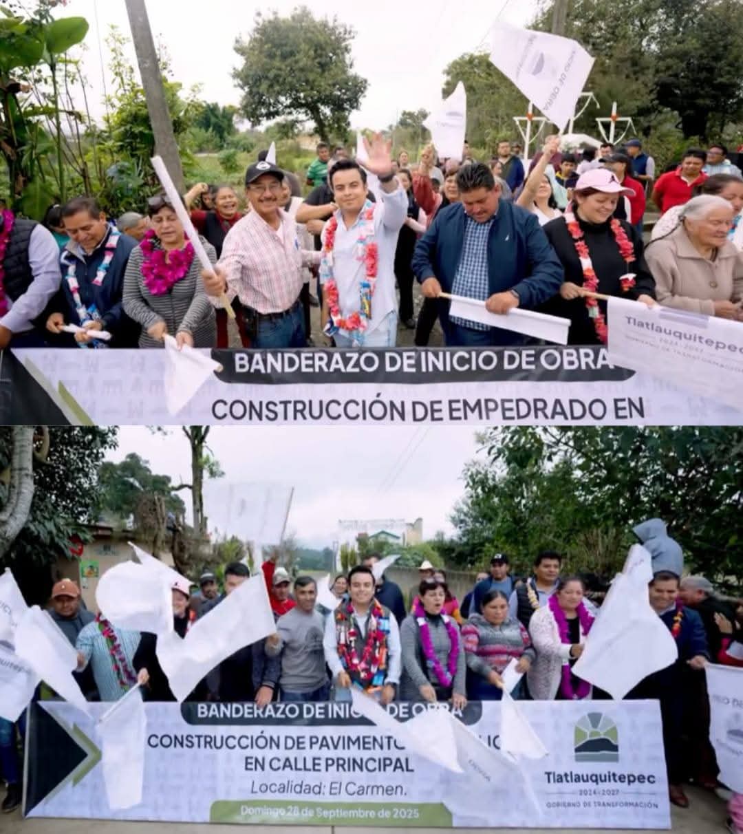 Tlatlauquitepec, Pue.- Mejorando la movilidad y garantizando la seguridad vial de los ciudadanos y automovilistas, el Presidente Municipal de Tlatlauquitepec, Juan Manuel Téllez Salazar, encabezó el banderazo de inicio de obra para la construcción de un empedrado en la calle principal de la localidad de Ilita, así como para la pavimentación con concreto hidráulico en la calle principal de El Carmen.