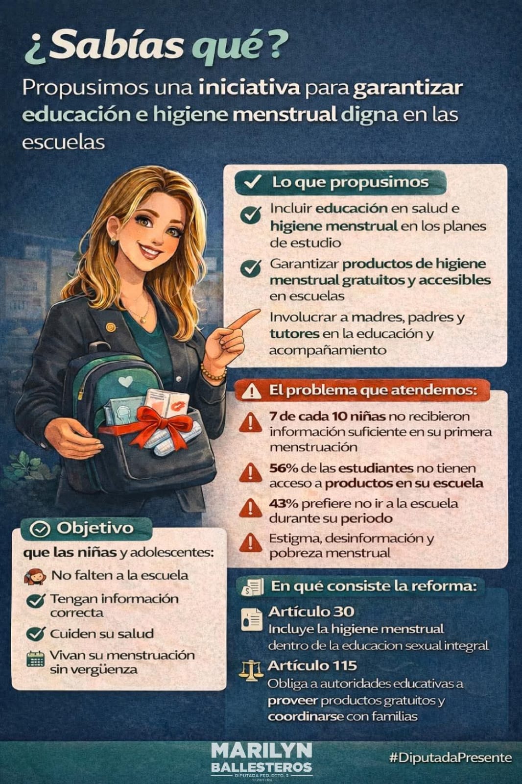 México, CDMX.- La atención a la higiene menstrual en el entorno escolar es prioritaria debido a las condiciones que enfrentan niñas y adolescentes en su vida diaria y en este contexto, la Diputada Federal por Teziutlán, Marilyn Ballesteros y presidenta de la Comisión de Educación presentó una iniciativa para reformar la Ley General de Educación con el objetivo de garantizar educación e insumos básicos en las escuelas. La propuesta busca atender una problemática que impacta directamente en la asistencia, el bienestar y el desarrollo educativo de las estudiantes.