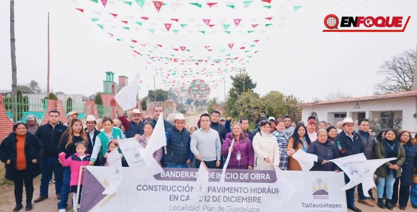 Tlatlauquitepec, Pue.- Para lograr que Tlatlauquitepec pase al siguiente nivel y siga concretando su progreso y desarrollo se da seguimiento al programa de mejora de la infraeatructura de caminos, calles y vialidades y tener mayor conectividad en el municipio el Presidente Municipal, Juan Manuel Téllez Salazar, encabezó el banderazo de inicio de obra para la pavimentación con concreto hidráulico de la calle "12 de Diciembre" en la localidad de Plan de Guadalupe.