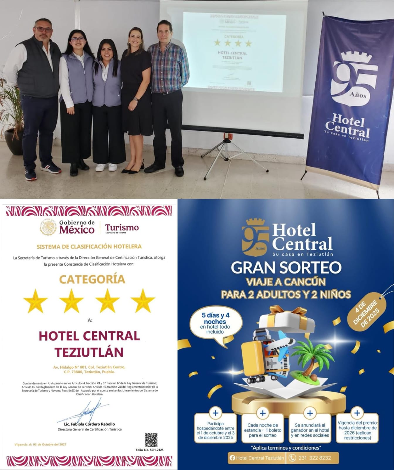 Teziutlán, Pue.- La historia de un hotel no solo se mide por los años que han pasado, sino por su evolución, adaptabilidad y la confianza que ha construido con sus clientes, es parte del mensaje que brinda Hotel Central “Su Casa en Teziutlán” que celebra sus 95 años de trayectoria, consolidado como un espacio emblemático que combina tradición con modernidad. En rueda de prensa por su 95 aniversario, los propietarios Adriana y José Manuel Lainz Rodes así como el gerente Alejandro González Pérez, destacaron que el establecimiento, hoy clasificado oficialmente como hotel de cuatro estrellas por la Secretaría de Turismo del Gobierno de México, busca seguir creciendo dentro de una industria dinámica, donde la innovación, la comodidad y la seguridad son pilares de su servicio, destacando que la constancia de clasificación hotelera, vigente hasta el 3 de Octubre de 2027, reafirma la calidad y el compromiso que distingue a esta empresa la cual organiza un gran sorteo para sus huéspedes como parte de sus festejos.