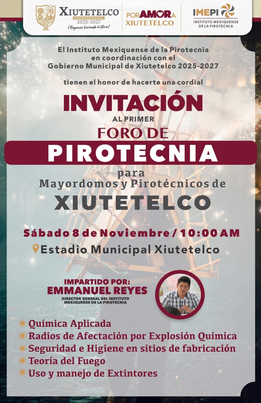 El evento, denominado "Primer Foro de Pirotecnia para Mayordomos y Pirotécnicos de Xiutetelco", fue anunciado en coordinación con el Instituto Mexiquense de la Pirotecnia (IMEPI) mediante una propuesta que busca fortalecer la prevención de accidentes a través de la profesionalización de quienes fabrican y utilizan productos pirotécnicos.