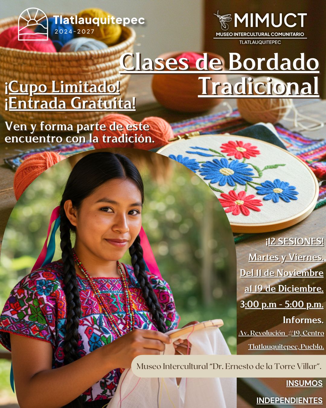 La programación cultural también incluye clases de bordado tradicional con entrada libre y cupo limitado, que se impartirán en el mismo museo los martes y viernes, del 11 de Noviembre al 19 de Diciembre, en un horario de tres a cinco de la tarde. Los insumos son independientes y las inscripciones están disponibles en Avenida Revolución número 19, colonia Centro para así preservar los saberes que dan identidad al Pueblo Mágico.