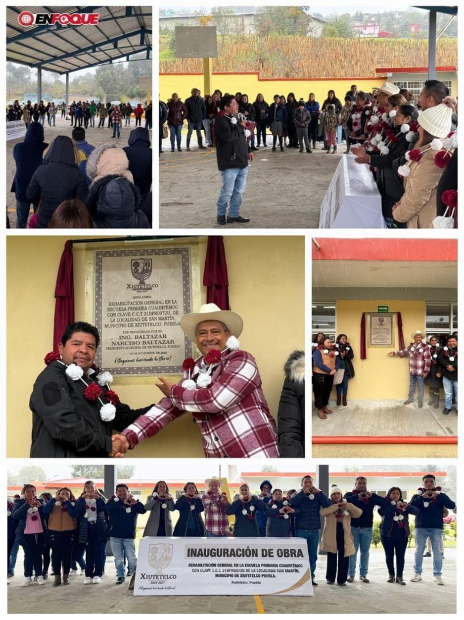 Xiutetelco, Pue.- La rehabilitación, equipamiento y mejora de espacios educativos es una apuesta directa por el futuro de la niñez, aseguró el Presidente Municipal de Xiutetelco Baltazar Narciso Baltazar, quien visitó la comunidad de San Martín para inaugurar la rehabilitación general de la Escuela Primaria "Cuauhtémoc", acompañado de padres de familia, alumnos y personal educativo quienes reconocieron que que la modernización de las instalaciones permitirá ofrecer un entorno seguro, limpio y funcional para las actividades académicas y recreativas.