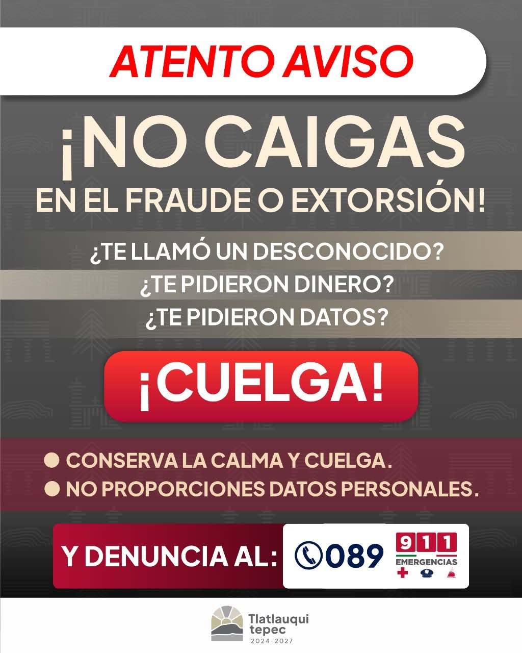 El a través de un comunicado el ayuntamiento informó que, ante cualquier llamada de un número desconocido, lo más recomendable es no contestar, en caso de hacerlo y recibir amenazas, la acción inmediata debe ser colgar y evitar continuar con la conversación recordando a los ciudadanos que ninguna autoridad ni institución legítima solicita información personal por teléfono, por lo que compartir datos personales, ubicaciones o información familiar puede poner en riesgo la integridad de las personas.