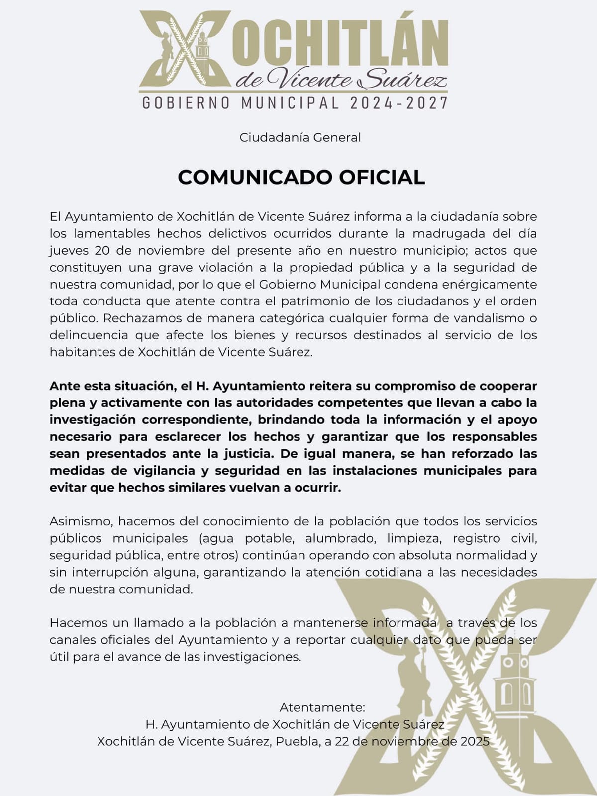 En Xochitlán de Vicente Suárez en la Sierra Norte poblana, el 20 de Noviembre alrededor de las tres de la madrugada la Policía Municipal recibió una llamada, donde un sujeto haciéndose pasar por el edil, José Luis Tirado Cabañes, presumiéndose que clonaron su número telefónico, solicitó que le llevaran una patrulla y que alguien más pasaría por ella, por lo que se entregó sin más cuestionamientos, a las 7 de la mañana que se realizó el cambio de turno se notificó de este movimiento y los elementos se dieron cuenta de que se trató de un engaño por lo que se reportó la unidad M-285 como robada.