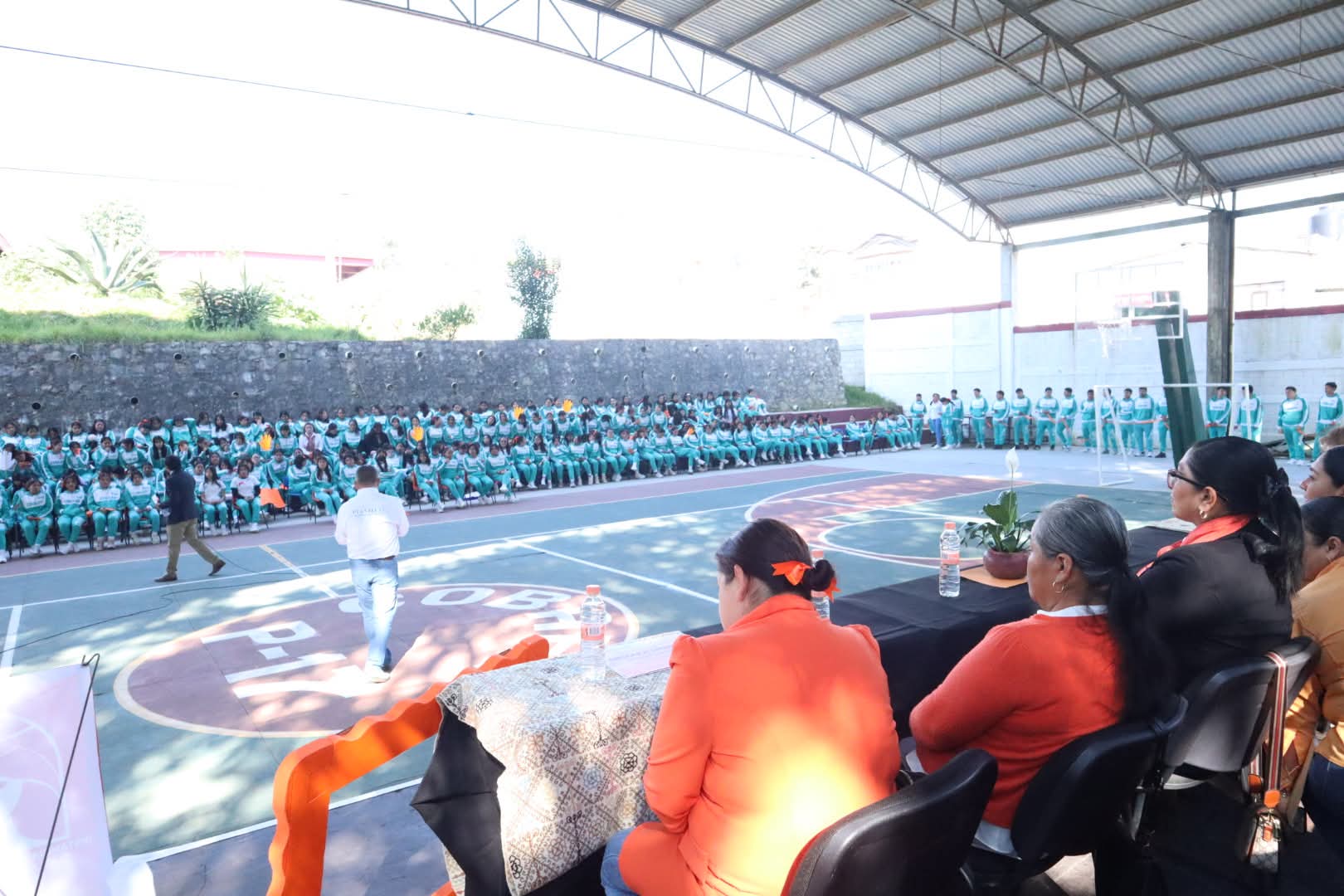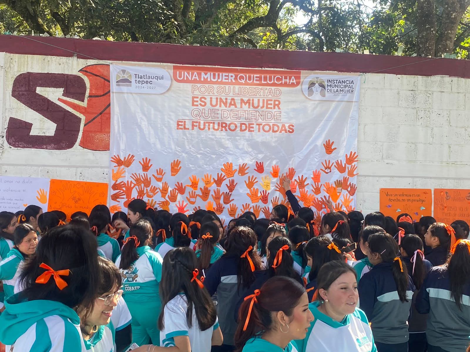 Tlatlauquitepec, Pue.- Con la suma de esfuerzos institucionales en Tlatlauquitepec se trabaja para prevenir la violencia y promover valores como la inclusión, la equidad y el respeto a los derechos humanos desde la escuela, por lo que este día se celebró el Día Internacional de la Eliminación de la Violencia contra la Mujer en el COBAEP Plantel 17, donde ante la comunidad escolar se refrendó el compromiso del gobierno que preside Juan Manuel Téllez Salazar y de su esposa María José Camacho León como presidenta del DIF de construir espacios seguros y libres de violencia para niñas, adolescentes y mujeres.