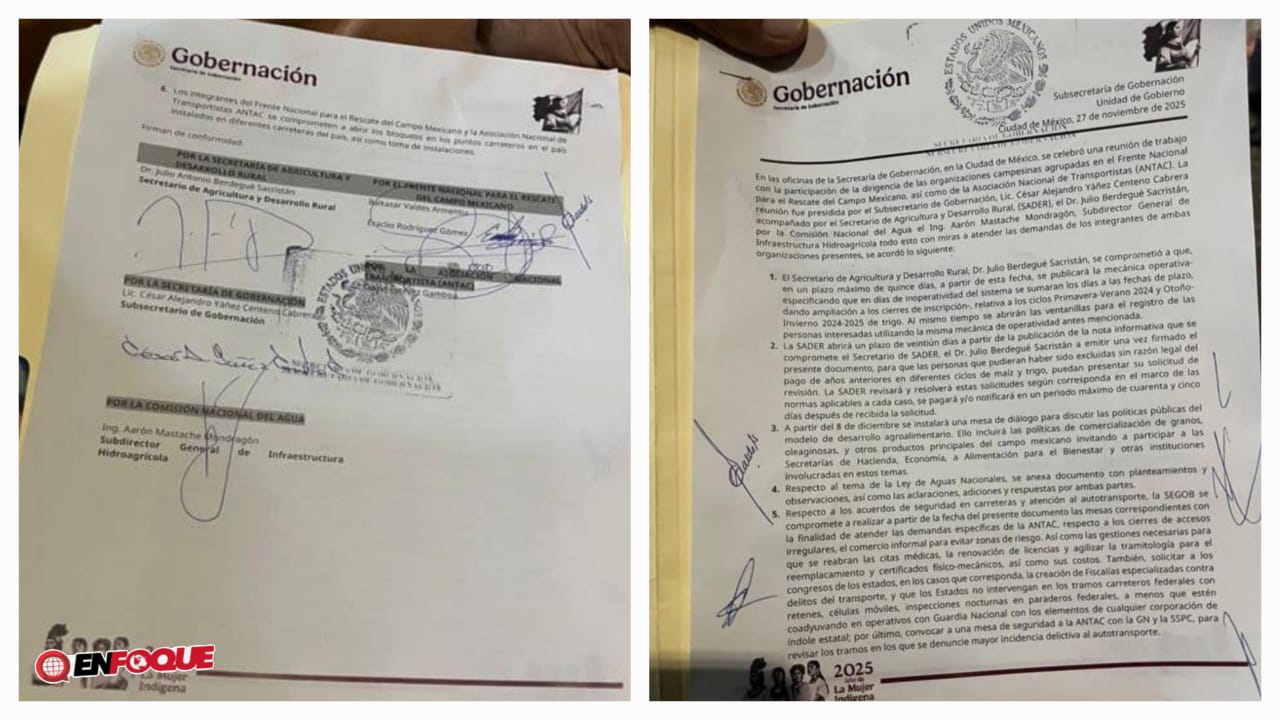 Entre los acuerdos principales, el gobierno se comprometió a cubrir todos los adeudos de maíz y trigo, liberar los montos atrasados del esquema de compensación y agilizar los recursos para que los productores puedan reanudar labores agrícolas, también se determinó la creación de una mesa nacional permanente, que arrancará el 8 de Diciembre, para revisar uno por uno los temas estructurales del campo, ahí participarán Segob, Agricultura y otras dependencias con el objetivo de dar seguimiento puntual a cada conflicto.