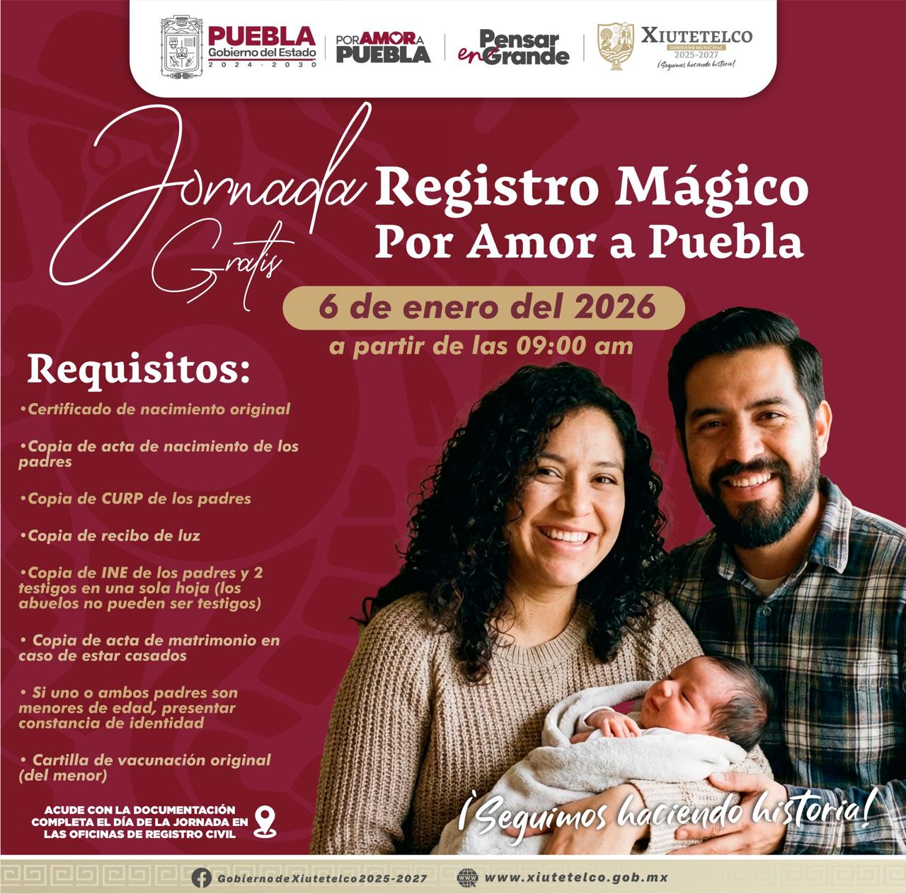 De manera paralela a la celebración de los Reyes Magos, se llevará a cabo la Jornada de Registro Mágico “Por Amor a Puebla”, enfocada en facilitar el registro oportuno de niñas y niños, la intención es que madres y padres puedan realizar este trámite de forma directa, acudiendo con la documentación completa a las oficinas del Registro Civil durante el desarrollo de la jornada.