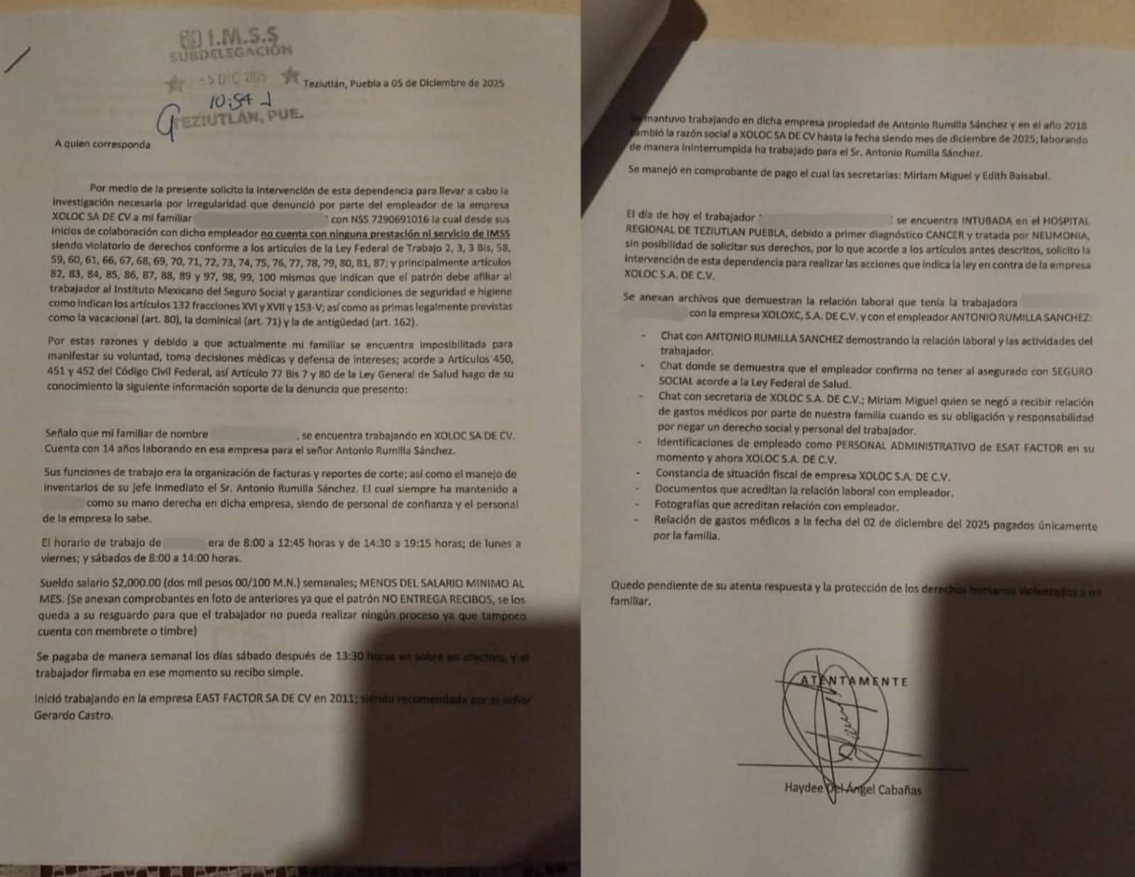 El caso involucra a la maquila Xoloc S.A. de C.V., donde Marce “N”, empleada con más de 14 años de antigüedad, laboró sin estar asegurada ante el Instituto Mexicano del Seguro Social (IMSS), sin prestaciones y bajo condiciones denunciadas como abusivas. Su estado de salud se deterioró de forma acelerada en Diciembre pasado y, ante la falta de atención médica oportuna por no estar asegurada y ante la ausencia total de respaldo de su patrón Antonio Rumilla Sánchez, falleció tras permanecer hospitalizada en el Hospital General de Teziutlán al rededor de una semana en condiciones críticas, con todos los gastos cubiertos por su familia.