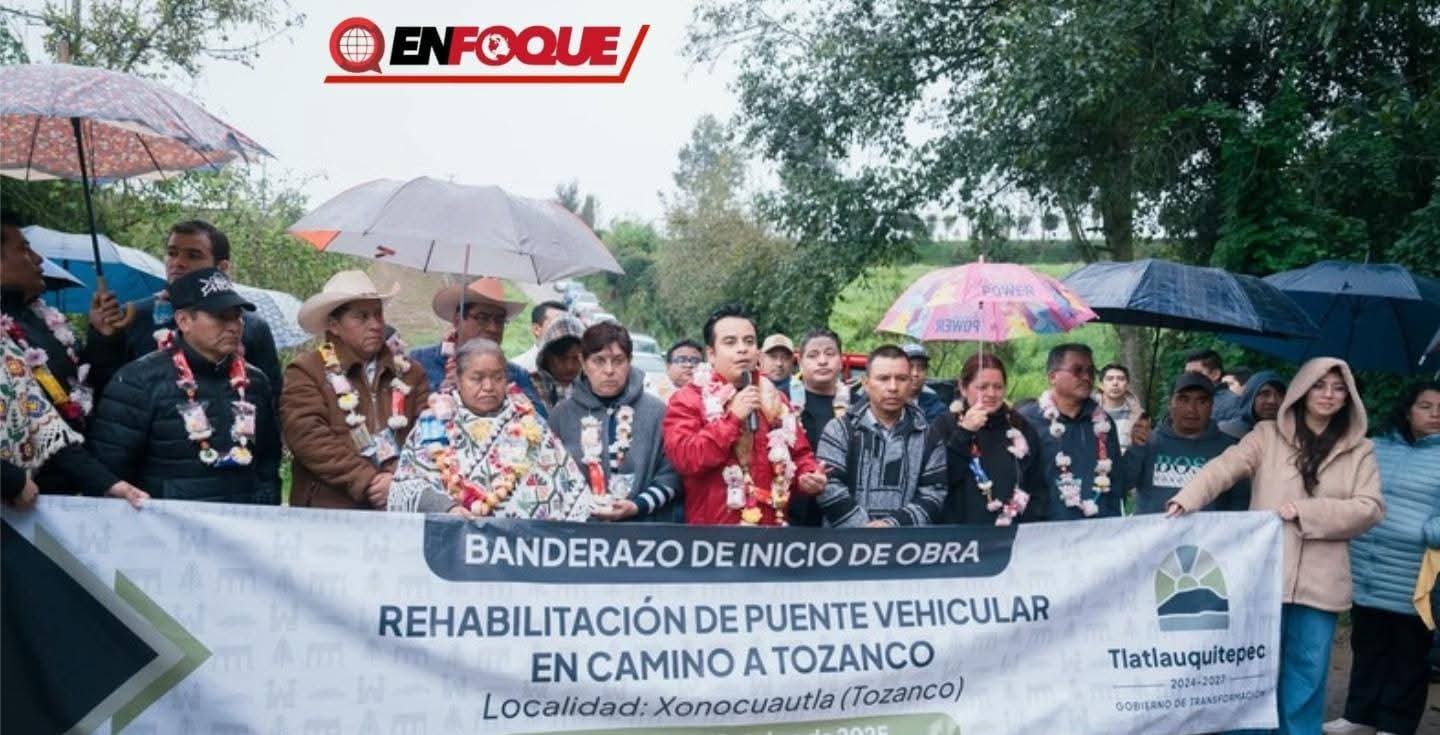 Tlatlauquitepec, Pue.- Continuando con el proyecto para la mejora de accesos y vialidades en las diferentes comunidades de Tlatlauquitepec, el Presidente Municipal, Juan Manuel Téllez Salazar, dió el banderazo de inicio para los trabajos de rehabilitación del puente vehicular en camino a Tozanco en la comunidad de Xonocuautla, una obra que también beneficiará a los habitantes de Xopanaco, Acocontla, así como a otras comunidades cercanas que utilizan este camino como salida hacia Ocotlán.