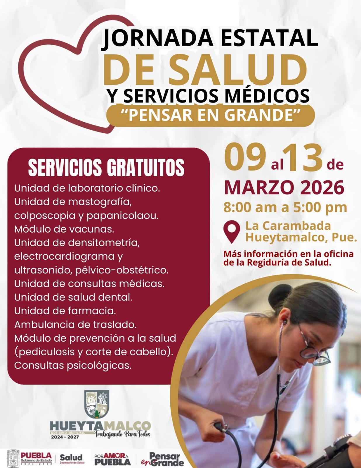 Hueytamalco, Pue.- Con el objetivo de acercar servicios médicos a la población y fortalecer el cuidado de la salud en el municipio, el Ayuntamiento de Hueytamalco encabezado por el Presidente Municipal, Iván Luna dió inicio a la Jornada Estatal de Salud y Servicios Médicos "Pensar en Grande", jornada en la que se ofrecerán diversos servicios gratuitos para las familias del municipio y la región a partir de este lunes hasta el viernes de esta semana.