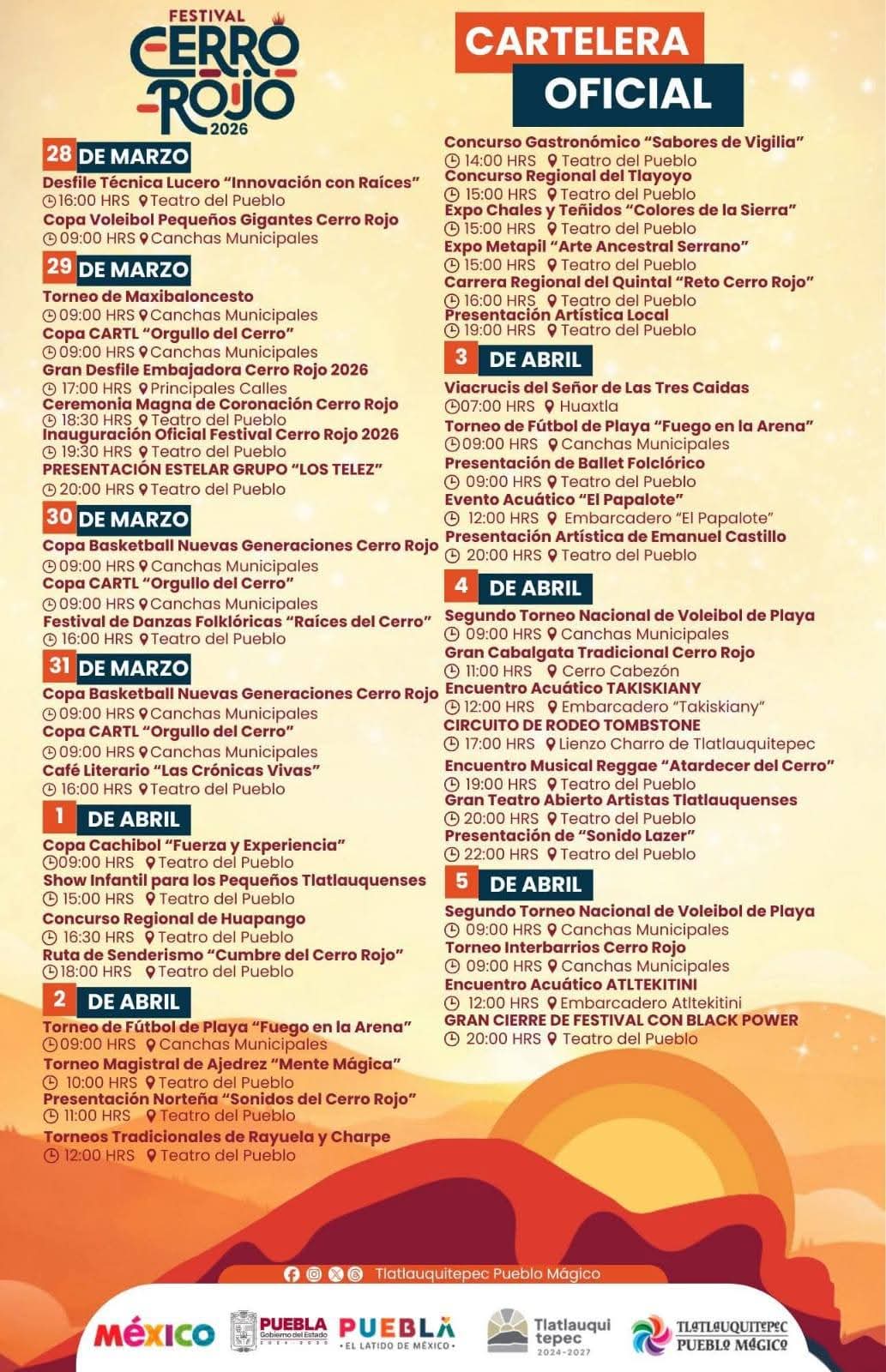 "Festival del Cerro Rojo 2026" en Tlatlauquitepec del 28 de Marzo al 5 de Abril